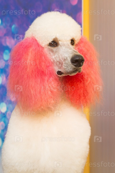 Ухоженный белый милый пудель с кудрявым мехом. Портрет морды крупным планом. Это самая умная порода собак