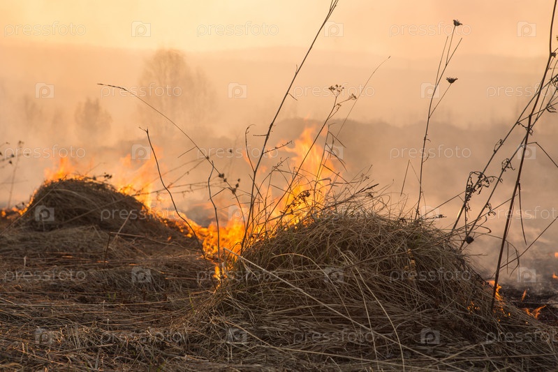 Лесной пожар горит, лесной пожар крупным планом в дневное время