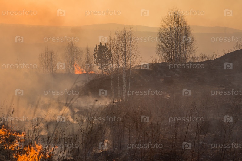 Лесной пожар горит, лесной пожар крупным планом в дневное время
