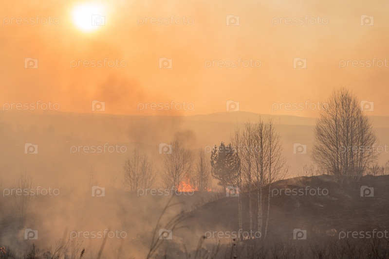 Лесной пожар горит, лесной пожар крупным планом в дневное время
