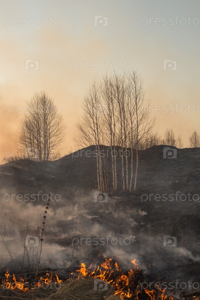 Лесной пожар горит, лесной пожар крупным планом в дневное время