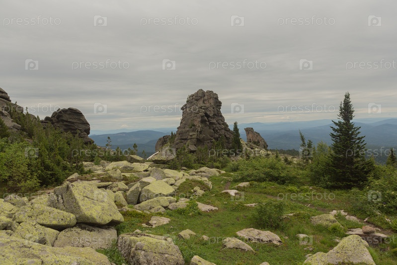 Большие камни курума лежат в лесу в горах, камни покрытые мхом, на фоне леса, горный пейзаж, высоко в горах