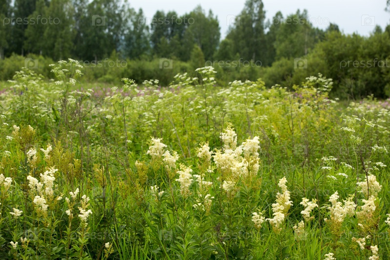 Прекрасно цветущий белый Filipendula ulmaria или тальга - лиственничный цвет на берегу реки.Таволгу использовали при простуде, респираторных заболеваниях, кислотности, язвенной болезни, артрите