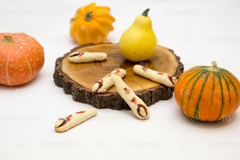 Печенье на Хэллоуин, печенье «Ведьмины пальцы» с шоколадом, забавное осеннее печенье, сезонные праздничные сладости. Концепция вечеринки на Хэллоуин. Вид сверху