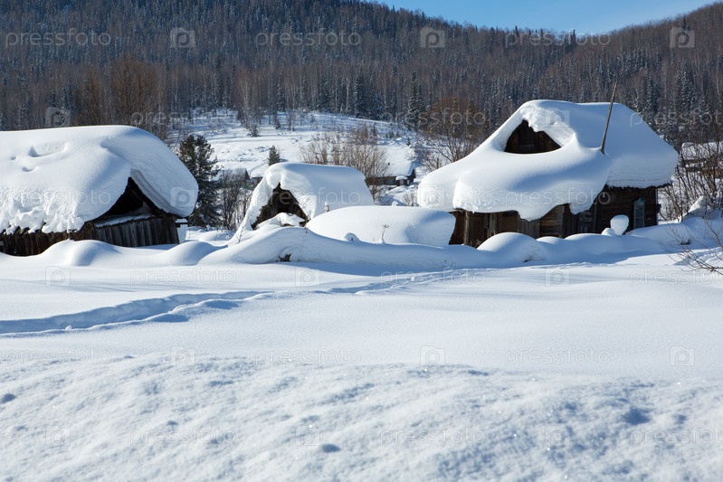 Старый деревянный дом из серых бревен. Зимний русский пейзаж. Заснеженные деревья. Старая русская деревня, покрытая снегом