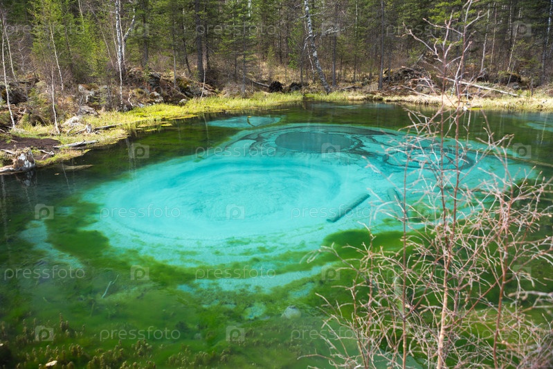 Голубое гейзерное озеро в весеннем лесу. Алтайские горы, Сибирь, Россия
