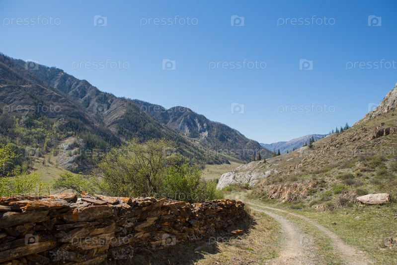 Чуйский тракт, старая дорога. Вид со старой горной дороги, вид на каменную кладку, грунтовую дорогу и склон горы. Россия, Алтай