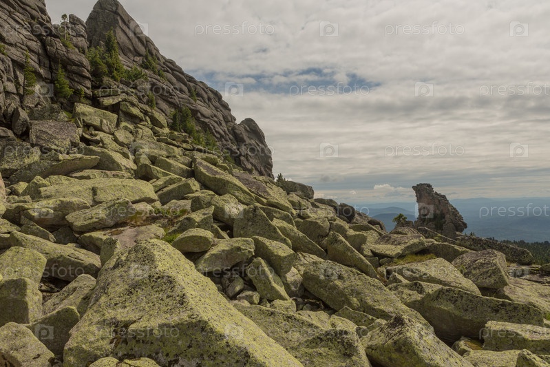Большие камни курума лежат в лесу в горах, камни покрытые мхом, на фоне леса, горный пейзаж, высоко в горах