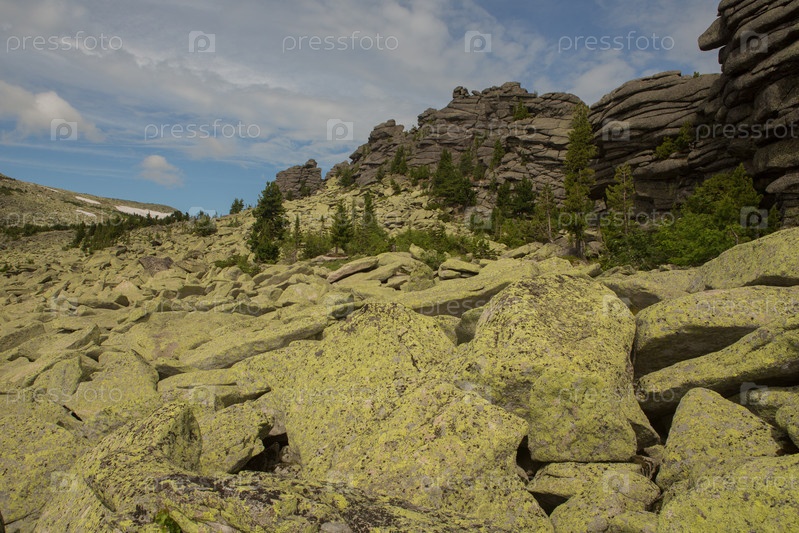 Большие камни курума лежат в лесу в горах, камни покрытые мхом, на фоне леса, горный пейзаж, высоко в горах