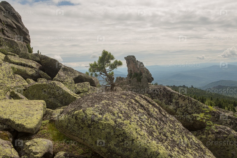 Большие камни курума лежат в лесу в горах, камни покрытые мхом, на фоне леса, горный пейзаж, высоко в горах