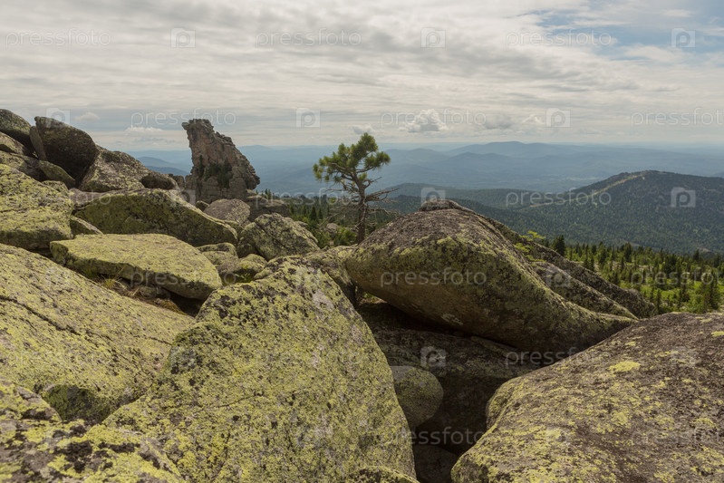 Большие камни курума лежат в лесу в горах, камни покрытые мхом, на фоне леса, горный пейзаж, высоко в горах