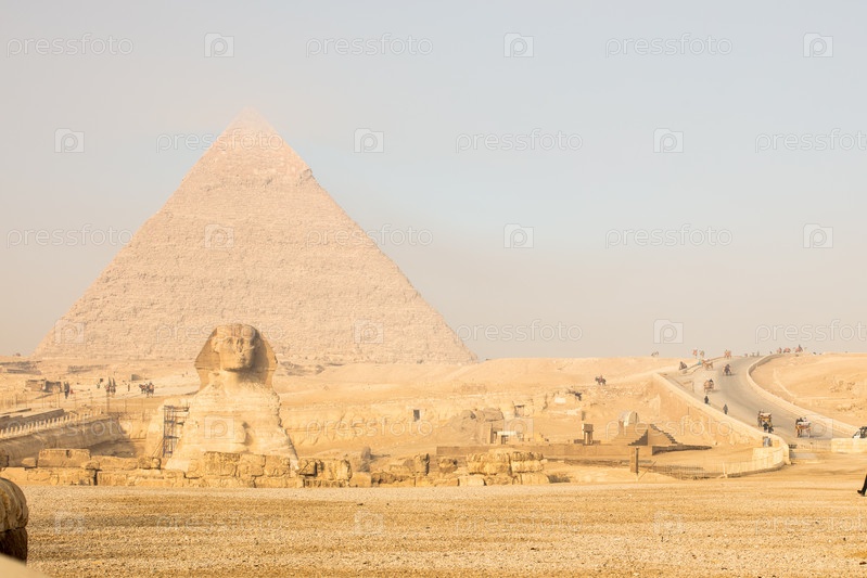 Пейзаж с египетскими пирамидами, Великим Сфинксом и силуэтами Древние символы и достопримечательности Египта для вашей концепции путешествия в Африку в золотом солнечном свете. Сфинкс в комплексе пирамид Гизы на закате