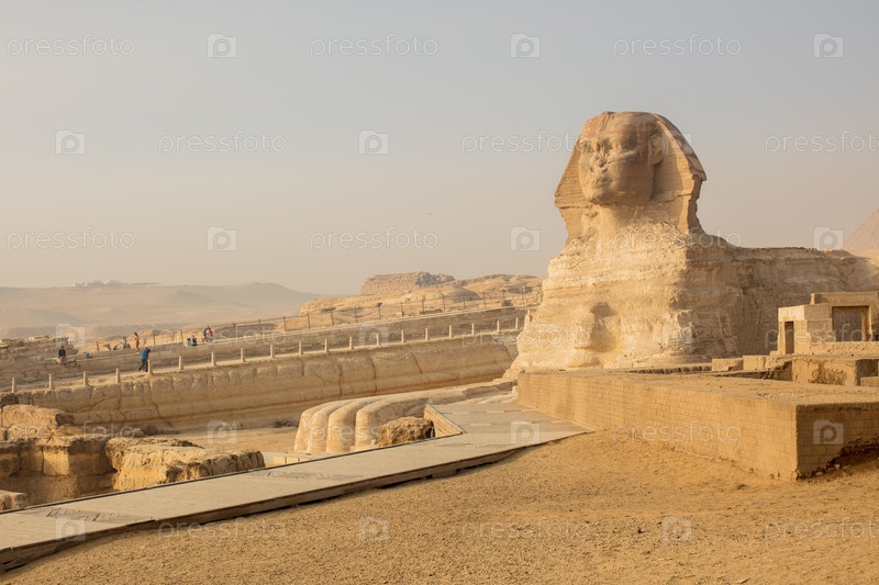 Пейзаж с египетскими пирамидами, Великим Сфинксом и силуэтами Древние символы и достопримечательности Египта для вашей концепции путешествия в Африку в золотом солнечном свете. Сфинкс в комплексе пирамид Гизы на закате