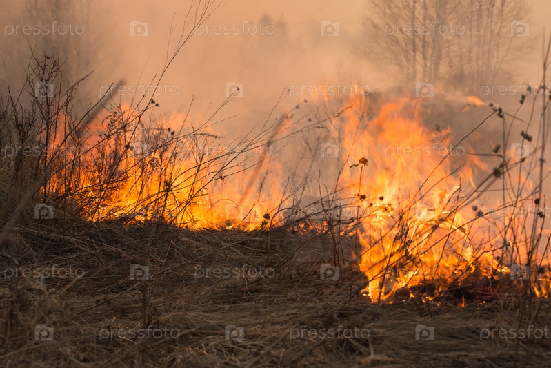 Лесной пожар горит, лесной пожар крупным планом в дневное время