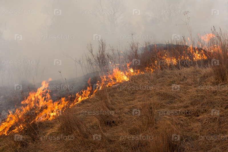 Лесной пожар горит, лесной пожар крупным планом в дневное время