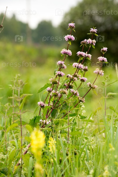 Лекарственное растение Пустырник растет в поле среди цветущих трав летом. Летний пейзаж с цветущим пустырником
