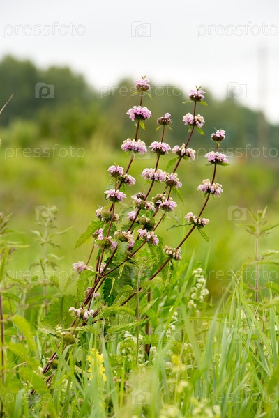 Лекарственное растение Пустырник растет в поле среди цветущих трав летом. Летний пейзаж с цветущим пустырником