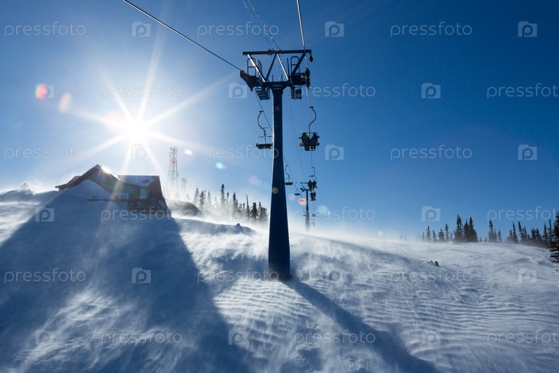 Вид с вершины горы на горнолыжный курорт Шерегеш и горы Алтая или Горной Шории. Активный зимний отдых, лыжники и сноубордисты на горнолыжном склоне и подъемнике, красивая природа и спортивный досуг