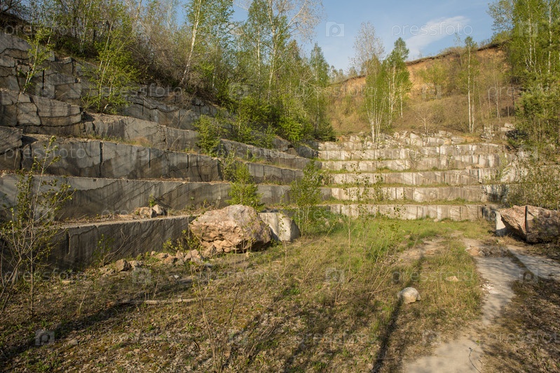 Добыча мрамора открытым способом. старый мраморный карьер. Россия, Новосибирская область.Искитим