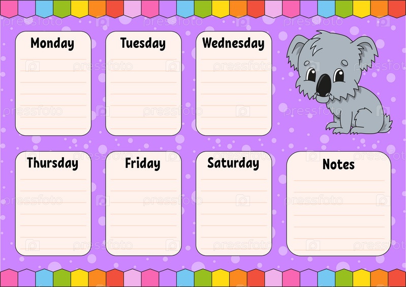 Расписание школы. Расписание для школьников. Пустой шаблон. Еженедельный планировщик с примечаниями. Изолированная цветная векторная иллюстрация. персонаж мультфильма