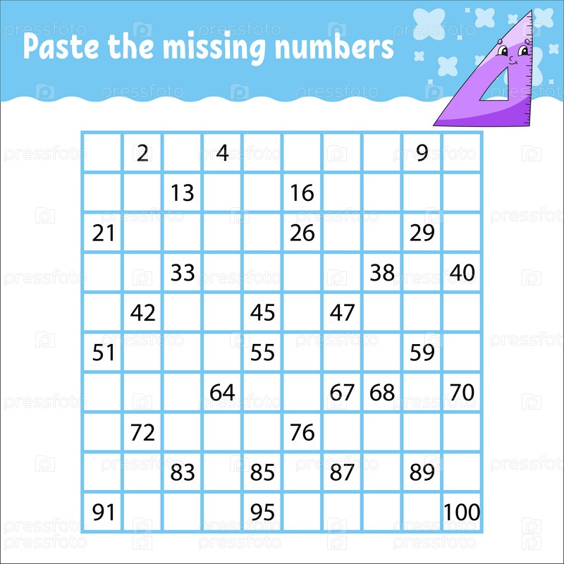 Вставьте пропущенные цифры от 1 до 100. Практика письма. Изучение цифр для детей. Развивающий рабочий лист. Страница с заданиями. Векторная иллюстрация