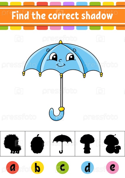 Найдите правильную тень. Рабочий лист по развитию образования. Страница с заданиями. Осенняя тема. Цветная игра для детей. Изолированная векторная иллюстрация. Персонаж мультфильма