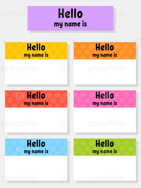 Привет, бейдж. Яркие наклейки. Прямоугольная этикетка. Цветная векторная изолированная иллюстрация