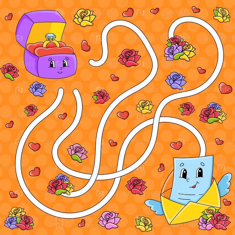 Абстрактный лабиринт. Игра для детей. Забавный лабиринт. Страница с заданиями. Головоломка для детей. Мультяшный стиль. Загадка для дошкольников. Логическая головоломка. Цветная векторная иллюстрация. День святого Валентина