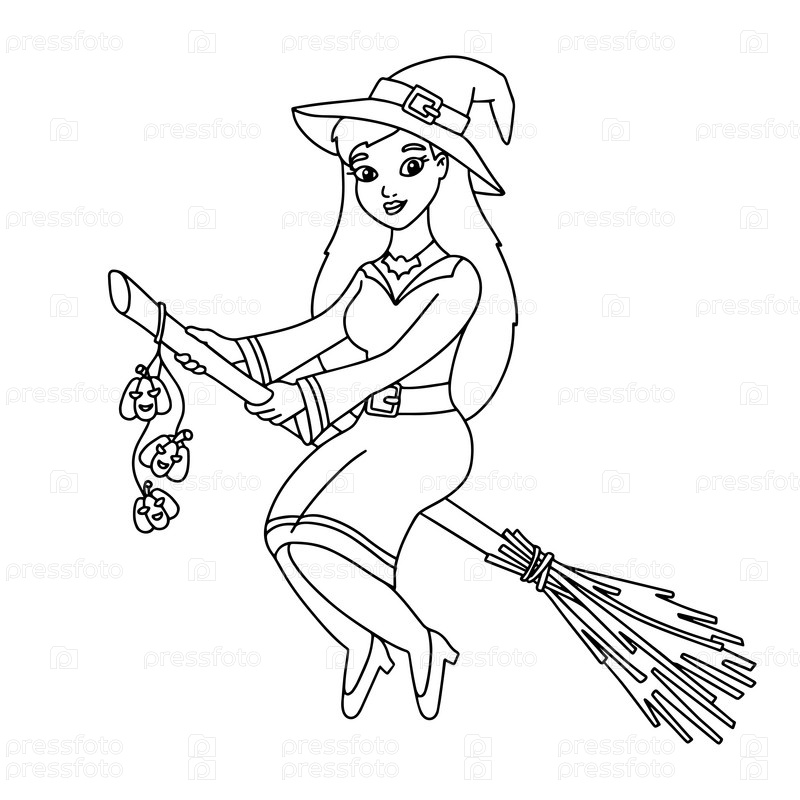 Милая ведьма в шляпе летит на метле. Страница раскраски для детей. Персонаж в мультяшном стиле. Векторная иллюстрация на белом фоне. Тема Хэллоуина