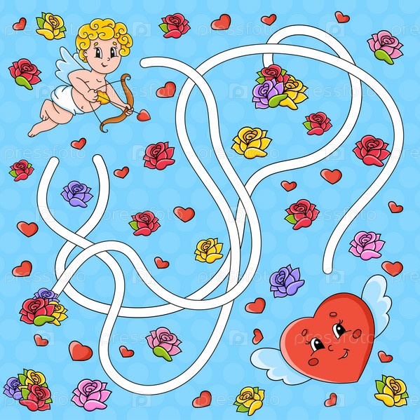 Абстрактный лабиринт. Игра для детей. Забавный лабиринт. Страница с заданиями. Головоломка для детей. Мультяшный стиль. Загадка для дошкольников. Логическая головоломка. Цветная векторная иллюстрация. День святого Валентина