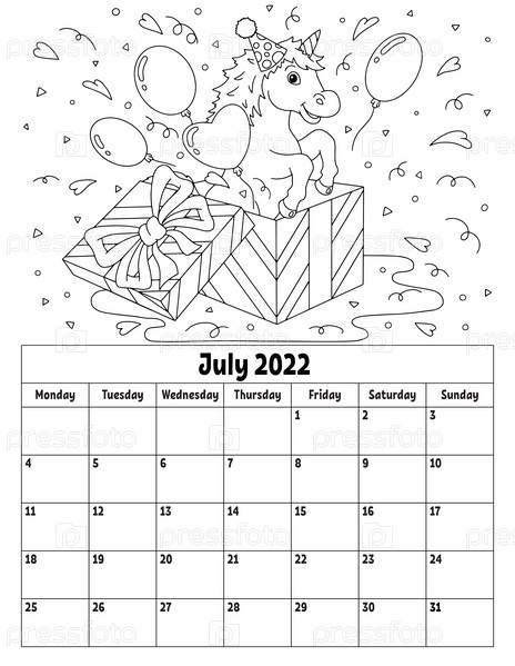 Вертикальный календарь на 2022 год с милым персонажем. Раскраска для детей. Неделя начинается в понедельник. Изолированная векторная иллюстрация. Мультяшный стиль