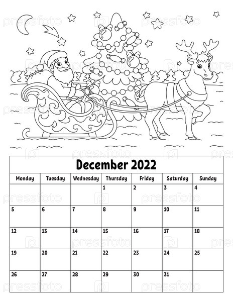 Вертикальный календарь на 2022 год с милым персонажем. Раскраска для детей. Неделя начинается в понедельник. Изолированная векторная иллюстрация. Мультяшный стиль