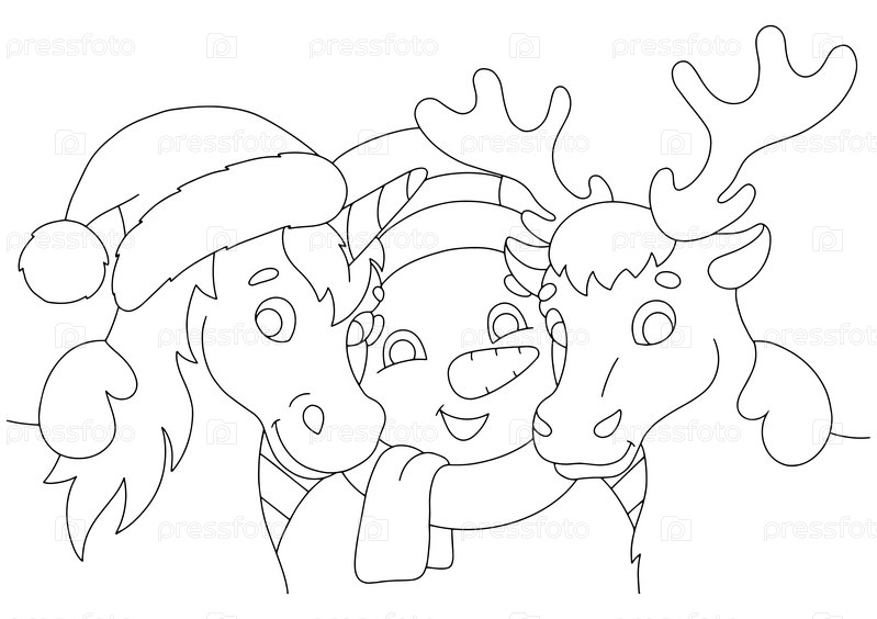 Единорог, олень и снеговик на Рождество. Страница раскраски для детей. Персонаж в мультяшном стиле. Векторная иллюстрация на белом фоне