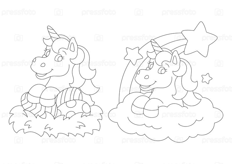 Набор из двух сказочных единорогов. Раскраска для детей. Персонаж в мультяшном стиле. Векторная иллюстрация на белом фоне