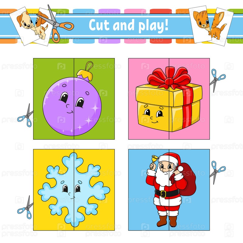 Разрезай и играй. Флэш-карты. Цветной пазл. Образовательный развивающий рабочий лист. Страница с заданиями. Игра для детей. Забавный персонаж. Изолированная векторная иллюстрация. Мультяшный стиль