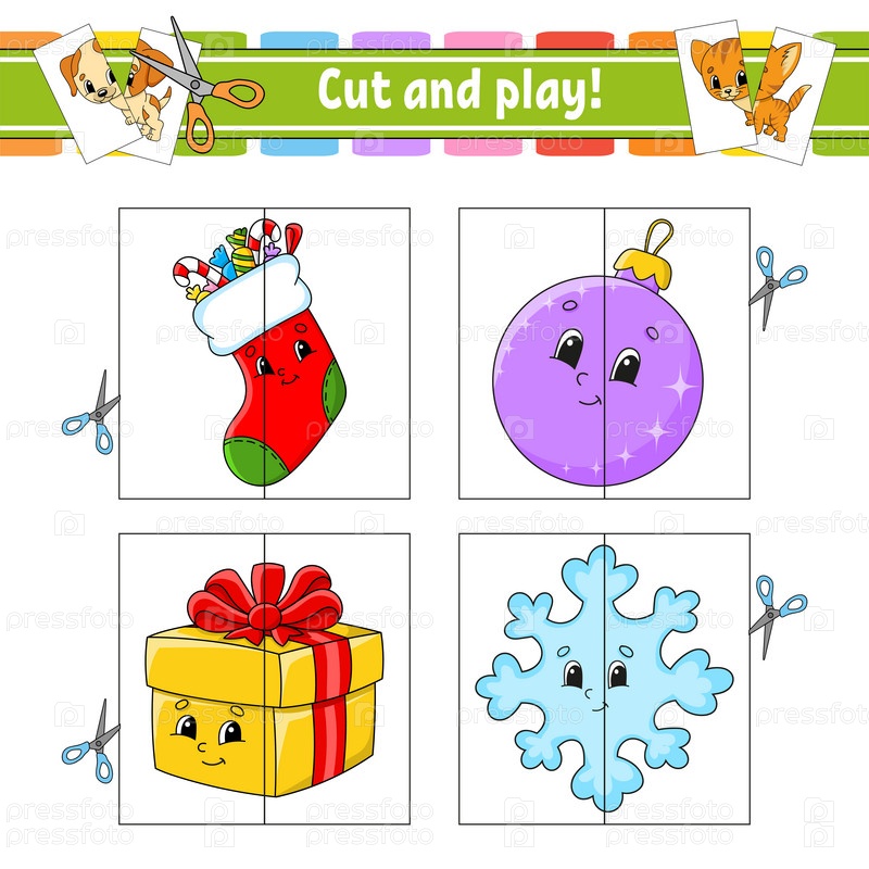 Разрезай и играй. Флэш-карты. Цветной пазл. Образовательный развивающий рабочий лист. Страница с заданиями. Игра для детей. Забавный персонаж. Изолированная векторная иллюстрация. Мультяшный стиль