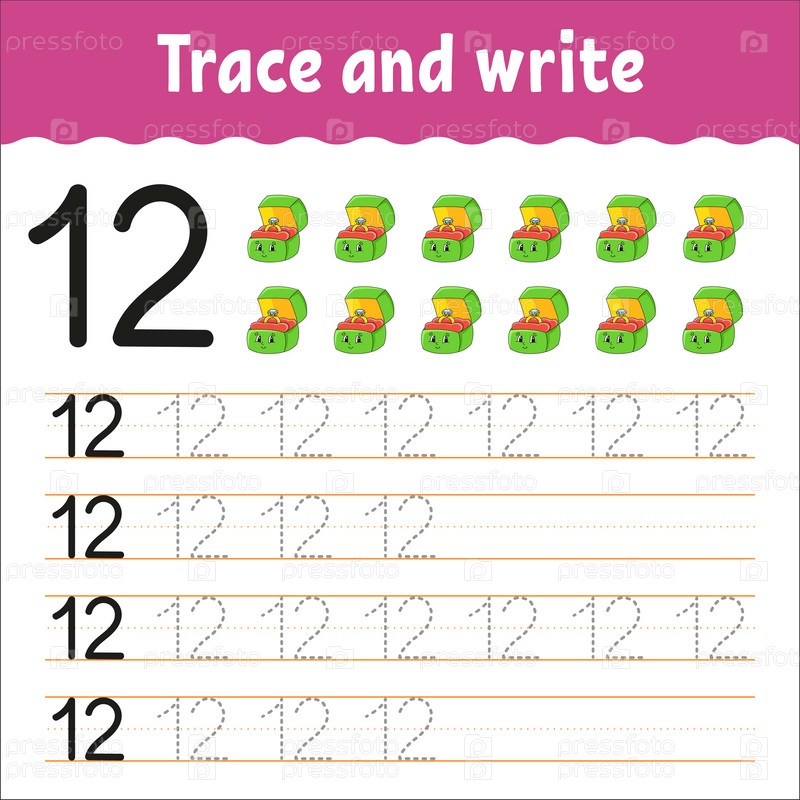 Изучайте цифры. Обводка и письмо. Практика письма. Образовательный развивающий рабочий лист. Цветная страница с заданиями. Изолированная векторная иллюстрация в милом мультяшном стиле