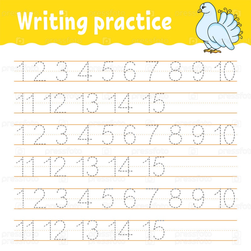 Изучайте цифры. Обводка и письмо. Практика письма. Образовательный развивающий рабочий лист. Цветная страница с заданиями. Изолированная векторная иллюстрация в милом мультяшном стиле