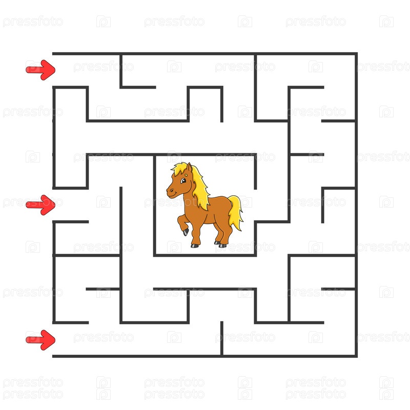 Квадратный лабиринт. Игра для детей. Головоломка для детей. Персонаж мультфильма. Загадка лабиринта. Найди правильный путь. Развитие логического и пространственного мышления. Векторная иллюстрация