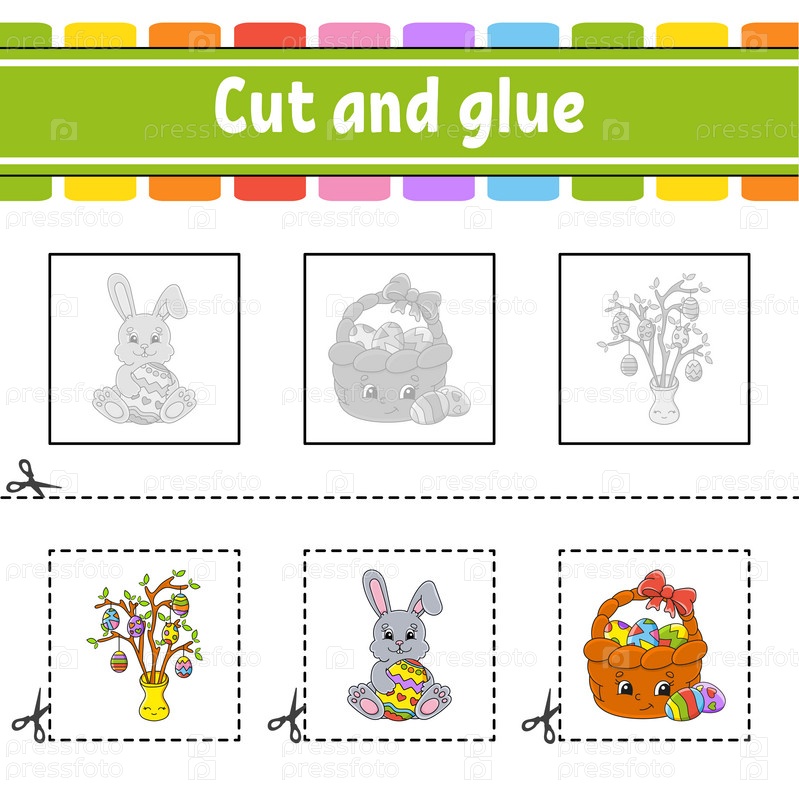 Вырезать и склей. Игра для детей. Образовательный развивающий рабочий лист. Цветная страница с заданиями. Персонаж мультфильма. Векторная иллюстрация