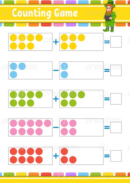 Сложение и вычитание. Задание для детей. Образовательный развивающий рабочий лист. Цветная страница активности. Игра для детей. Забавный персонаж. Мультяшный стиль. Векторная иллюстрация