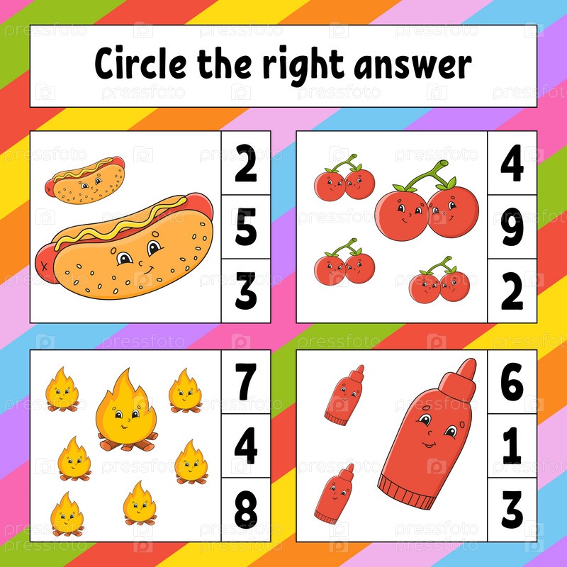 Обведите правильный ответ. Рабочий лист по развитию образования. Страница с заданиями и картинками. Игра для детей. Забавный персонаж. Мультяшный стиль. Векторная иллюстрация