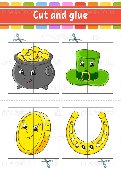 Разрезай и играй. Бумажная игра с клеем. Флэш-карточки. Образовательный рабочий лист. Страница с заданиями. День Святого Патрика. Изолированная векторная иллюстрация. Мультяшный стиль