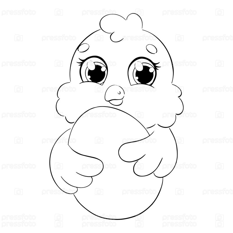 Пушистый цыпленок держит пасхальное яйцо. Страница раскраски для детей. Персонаж в мультяшном стиле. Векторная иллюстрация на белом фоне