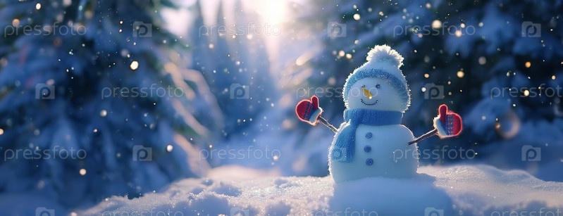 Улыбающийся снеговик в синем шарфе и красных варежках машет рукой на фоне волшебного зимнего пейзажа на рассвете