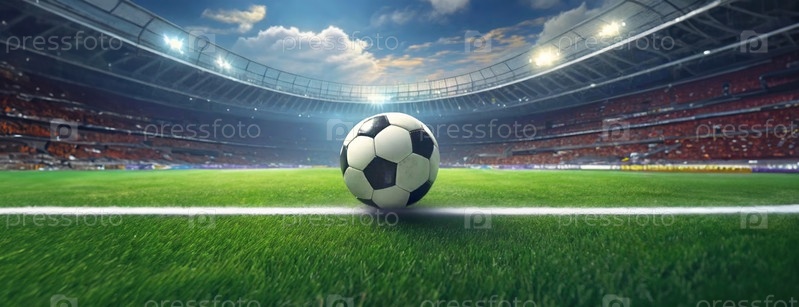 Футбольный мяч на зеленом поле. Яркое поле, всемирная страсть к спорту. Огромный стадион с электрической атмосферой, готовый к матчу, который зажигает дух болельщиков и игроков