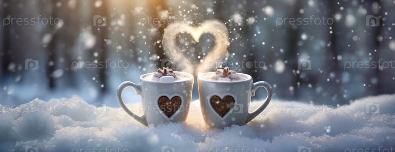 Теплое сияние горячего шоколада в снежной безмятежности передает суть Дня святого Валентина в причудливой зимней стране чудес. Панорама с местом для копирования. Снегопад на заднем плане