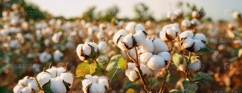 Зрелая хлопковая плантация с пушистыми белыми коробочками хлопка, светящимися в теплом свете заката. Панорама с копировальным пространством