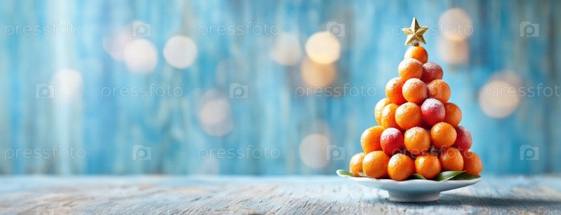 Рождественская елка из сложенных друг на друга мандаринов, увенчанная золотой звездой. Праздничная фруктовая композиция расположена на размытом фоне с мягкими огнями боке, вызывая радостное праздничное настроение