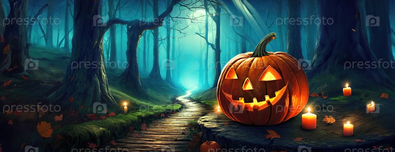 Сцена на Хэллоуин с резной тыквой и свечами в темном туманном лесу, создающая жуткую и таинственную атмосферу